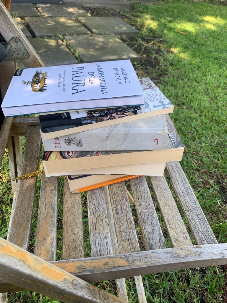 2) Mi metto in giardino (il mio studio verde) e leggo. Sette libri un giorno e sette libri un altro. Il metodo è quello della sottolineatura dei punti salienti. Alcuni passi che mi colpiscono li riporto sui social.