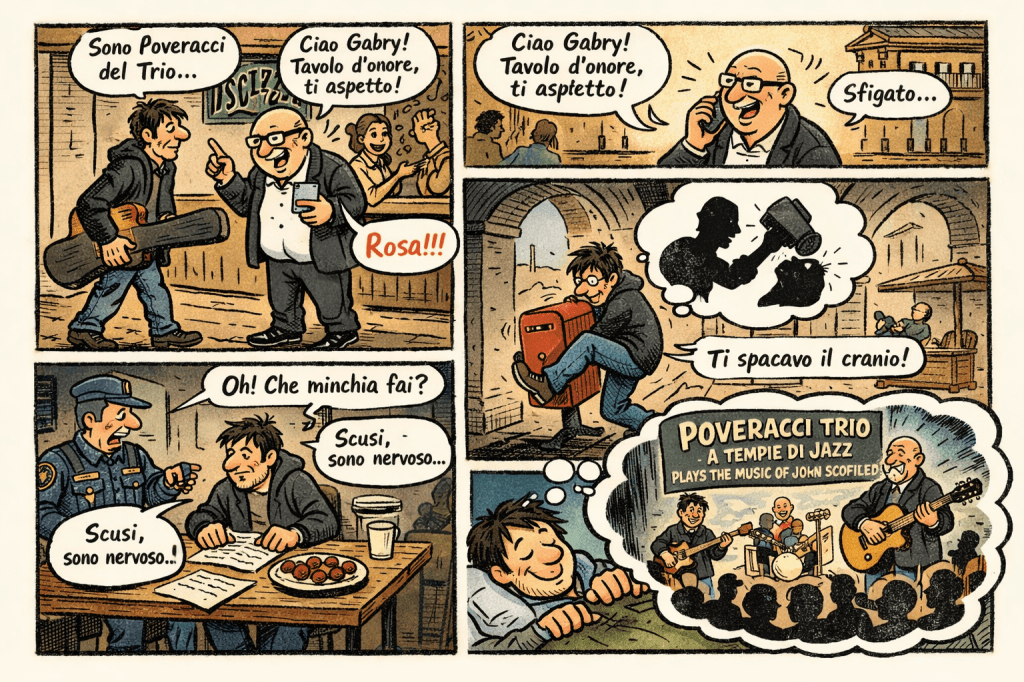 Poveracci: – Passavo da qui… per il mio quartetto… posso o sta affettando? Oste Jazz: – … chi sei? chi sei? Poveracci: – Poveracci… quello della mail… della telefonata… sono il Poveracci Trio…. Oste Jazz – … Rosa! Rosa!… quanti sono a tavola? Poveracci – … posso ripassare se… Oste Jazz: – …Pronto?… Carissimo!… Certo, certo… 24, 25, 26 bloccati!… porta chi cazzo vuoi, avete tavolo d’onore… saluta Gabry… ahahaha…eheheh…sì, sì il disco spacca… cosa vuoi che ti dica? Bacio! Poveracci: – … Oste Jazz: – “Click!” Poveracci: – Se vuole posso rimandarle mail, se è impegnato… può scaricare il file del nostro cd… Oste Jazz: – … scaricare, scaricare… la casse di birra ti posso scaricare… che genere fate? Basta che non è roba con elettronica vi posso dare “Il lunedi da cani”. Ma se ne parla fra sei mesi… Poveracci: – … io suono la chitarra elettrica, ma posso venire senza effetti… Oste Jazz: – No elettronica! Rosaaaa! Rispondi cazzo! Poveracci: – La chitarra la devo… Oste Jazz: – Gennaio… aspé… gennaio… il 15… dopo le vacanze di Natale no… il 23… però vi faccio tre piatti di spaghetti… Poveracci: – il bassista viene da fuori, qualcosa per le… Oste Jazz: – se va bene, tranquillo… qualcosa ci esce… ma dì al batterista di portarsi la sua perché l’indomani suona… coso… come si chiama quello indiano? Poveracci: – ok allora per il 23 gennaio. Grazie e buona serata. Oste Jazz: – Rosaaaaaaa!