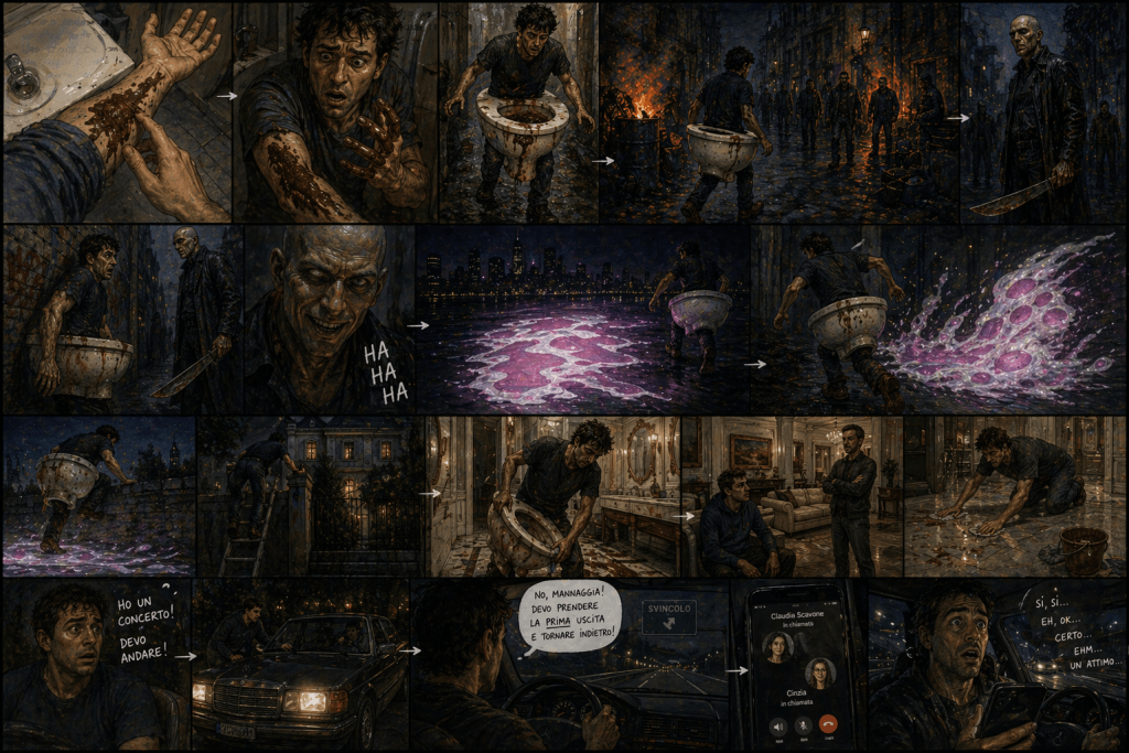 Attraverso una zona notturna che sembra uscita da Fuga da New York: bidoni in fiamme, vicoli, teppisti armati. Io avanzo rasente ai muri, cercando di non farmi notare. Tutti però mi guardano. Sono terrorizzato, soprattutto da uno: altissimo, completamente calvo, con un macete. Il vicolo si stringe e sono costretto a passargli accanto. Io, con questo gabinetto addosso, sporco, gli passo vicino. Lui mi guarda dall’alto, impugna il macete, poi ride con un ghigno. Riesco a passare. Dopo capisco: quella, paradossalmente, è una zona sicura.