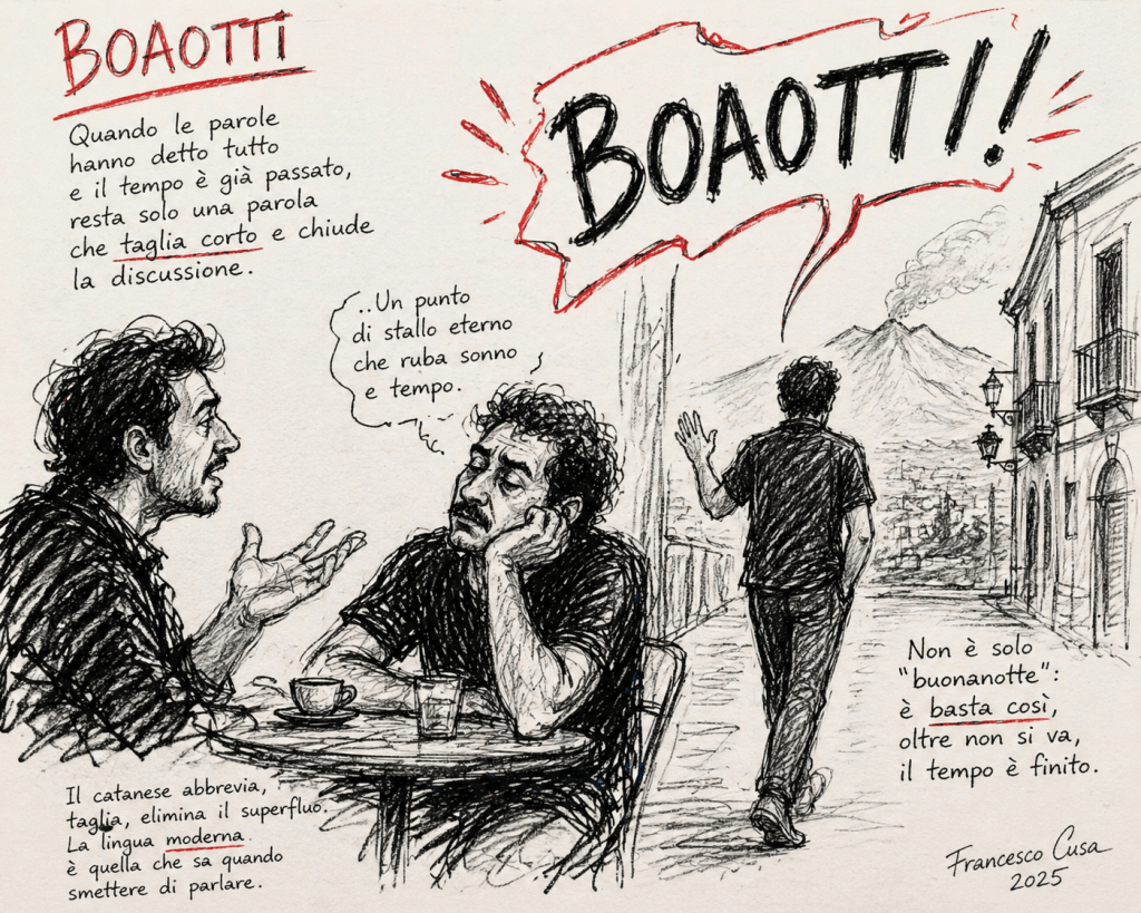 Il catanese è sempre stato “moderno” in un certo qual modo, da sempre ha fatto del tempo una ragione essenziale, in controtendenza con l’immagine classica di una Sicilia lenta, pigra e oziosa. Egli spesso rinuncia a consonanti superflue e scorcia senza problemi. Ad esempio. Quando si fa tardi e la discussione si prolunga inutilmente, in un particolare, non definibile, ma purtuttavia ineluttabile momento saliente della questione, cala come una mannaia la seguente sentenza: “avanti, Savvo, BOAOTTI!” (“Orsù, Salvo, abbiamo chiacchierato fin troppo in merito a questa problematica, ritengo opportuno dunque il porre fine al nostro interminabile botta e risposta, essendo giunti a un evidente punto di stallo che finirebbe col sottrarre a entrambi delle preziose ore di sonno”). Il catanese elimina dunque ben due consonanti (le due “N” di “bonanotti”), confidando sulla musicalità della frase che, pur contratta, finisce col riprodurre la medesima parola (“BOAOTTI” viene spesso pronunciato mentre si va già via, giunge come una eco significante “di per sé”, come se non fosse più nemmeno una parola, ma un gesto fonico autosufficiente, una specie di congedo che si compie mentre si compie l’azione stessa dell’andarsene). Non si dice BOAOTTI per comunicare qualcosa: lo si dice perché ormai non c’è più nulla da comunicare. È la lingua che prende atto del limite del discorso e lo chiude con un colpo secco, elegante nella sua brutalità. In questo senso il catanese è davvero moderno: taglia, abbrevia, elimina il superfluo non per povertà, ma per eccesso di consapevolezza. Sa che a un certo punto le parole eccedono la cosa, la dilatano inutilmente, la consumano. BOAOTTI interviene lì, come una cesura. Non è solo “buonanotte”: è “basta così”, “oltre non si va”, “il tempo è finito”. E infatti arriva sempre quando il tempo è già stato superato, quando la conversazione ha oltrepassato quella soglia invisibile oltre la quale non si aggiunge più nulla, ma si continua a parlare per inerzia, per abitudine, per paura del silenzio. Il catanese, invece, quel silenzio lo chiama. Lo anticipa. Lo impone. È una parola che contiene un’intera filosofia: la misura. Ma una misura non moralistica, non pedagogica — una misura pragmatica, quasi musicale.