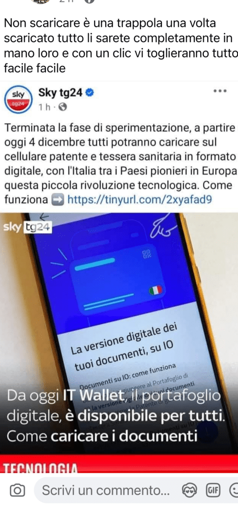 Purtroppo i Sapiens sono una specie corrotta e adesso divampa questa ridicola contrapposizione al naturale cambiamento evolutivo. Cascano le braccia. Ma tant’é. Il bello è che si è convinti di “averla fatta franca” con queste ridicole tattiche di contestazione. Io ovviamente ho caricato tutto su “IO” e mi godo certa fine di rotture di coglioni. Non ha ovviamente senso questo opporsi di default a qualsiasi innovazione volta alla semplificazione della vita dei cittadini: che si tratti di dati pubblici, del sistema sanitario ecc. ecc. Dati forniti ovviamente da “LORO” (sigh), ossia direttamene dai comuni ecc. ecc. (andare a registrarsi all’anagrafe, fare la dichiarazione dei redditi, o ricevere lo stipendio mensilmente nel conto corrente, invece parrebbe andare bene). La cosa che mi fa sorridere è che spesso queste ridicole proteste vengono proprio dai settori degli ex pentastellati, ossia di quelli che devono tutto al Casaleggio “rivoluzionario”, agli spettacoli del Grillo “illuminato”, che predicavano voto digitale, fine dei parlamenti ecc. Il problema è che, in questa poltiglia che è diventata oramai la società dei consum(at)i, si continua a confondere innovazione tecnologica con derive di controllo plutocratico (quelle sì mefitiche e da combattere, perché figlie di una metodica volta a governare e arginare il “cambiamento”, e paradossalmente, prodotto di retrive cordate di corruzione al soldo della finanza). Nessuna epoca ha mai visto un contrasto così furente tra innovazione e stasi. Lo spartiacque è stato certamente il 2020 con la vergognosa pagina del green pass, vera e propria dicotomizzazione su scala globale volta a sperimentare il reale potere di controllo degli apparati di potere sulle masse. Ciò ha finito col produrre, per converso (e a questo punto immagino strategicamente), una nuova classe di “luddisti”, di scettici di prammatica del tutto impermeabili a ogni forma di cambiamento tecnologico (sono gli stessi che fumano sigarette, prendono aerei, consumano plastica, usano la macchina anche per andare a due passi da casa, che hanno fatto il “Sessantotto”, la rivoluzione di classe ecc. ecc. ). Ma da qui a prendere le distanze da ogni forma di innovazione ce ne corre. L’essere umano ha sempre cercato la “meraviglia”, lo stupore… adesso pare che invece richiudersi a riccio nella propria zona comfort-analogica sia l’unico mantra di una generazione morente.