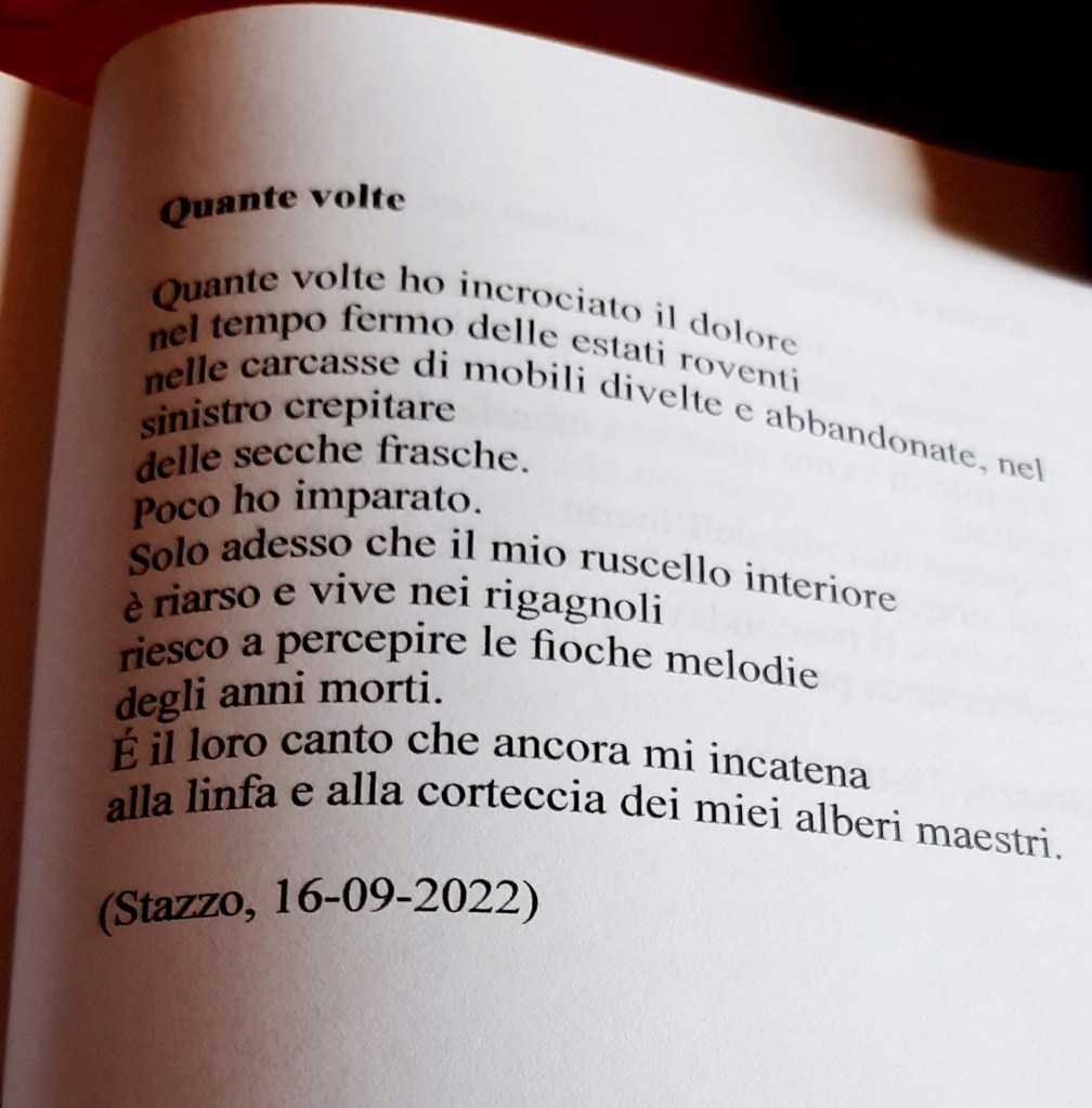 Quante volte ho incrociato il dolore nel tempo fermo delle estati roventi nelle carcasse di mobili divelte e abbandonate, nel sinistro crepitare delle secche frasche. Poco ho imparato. Solo adesso che il mio ruscello interiore è riarso e vive nei rigagnoli riesco a percepire le fioche melodie degli anni morti. É il loro canto che ancora mi incatena alla linfa e alla corteccia dei miei alberi maestri. (Stazzo, 16-09-2022)