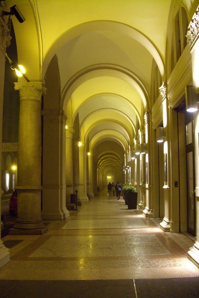 La vita s’addensa e raggruma con l’aria nei viluppi a far da guaina al passo un poco incerto del fantasma del mio tempo. Cala sotto i portici il sipario d’una Bologna che il passato mio divora ancora carica di ardori e vibrazioni d’un vissuto di memorie abbarbicate all’umido che all’ombra di navate ancora incrosta e nutre di miasmi la coscienza.