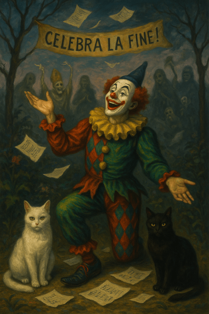 Io passo le mie giornate diurne nella piena solitudine del mio giardino. La sera metto in scena ciò che rimane del mio essere clown, la pantomima dell’essere sociale. La notte torno alla mia densa solitudine abitata da ogni sorta di creatura d’Oltremondo. Le mie gatte sono i miei due angeli custodi. Se c’è ancora qualcosa di soggettivo in me, lo potete ritrovare nei miei scritti e nelle musiche. Tutto il resto è recita. Delle retoriche ricorrenze dei sapiens più non mi curo. Festeggiate. Celebrate. Papi morti e ideologiche ricorrenze, mettete pure le vostre radici precarie nelle paludi dell’immane Significante. Il mio sguardo è fisso al futuro, che è sempre adesso, nell’immanenza panica di un’eterno risorgere.