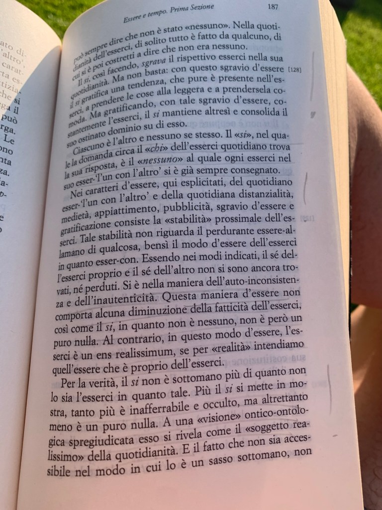 Proviamo ad affrontare queste due complesse pagine in Heidegger. “Ciascuno è l’altro e nessuno è se stesso”. “Si è nella maniera dell’auto-inconsistenza e dell’inautenticita”.